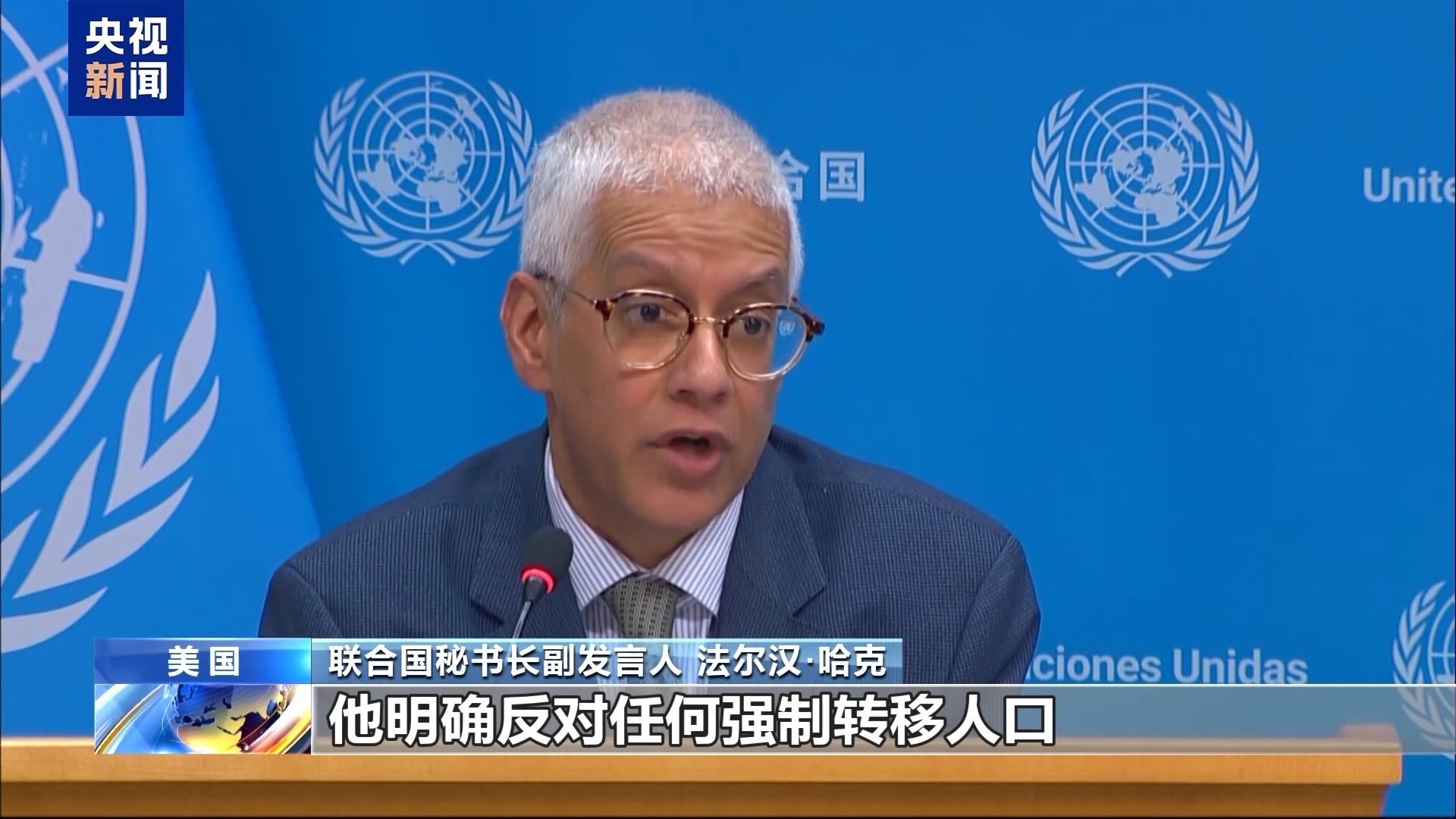 联合国秘书长副发言人 法尔汉·哈克:联合国秘书长古特雷斯已经强调过多次,他明确反对任何强制转移人口,也同样包括加沙地区的民众。除此之外,你也应该了解,联合国几十年来一直的立场是,巴勒斯坦领土问题应该由巴勒斯坦与以色列协商解决。